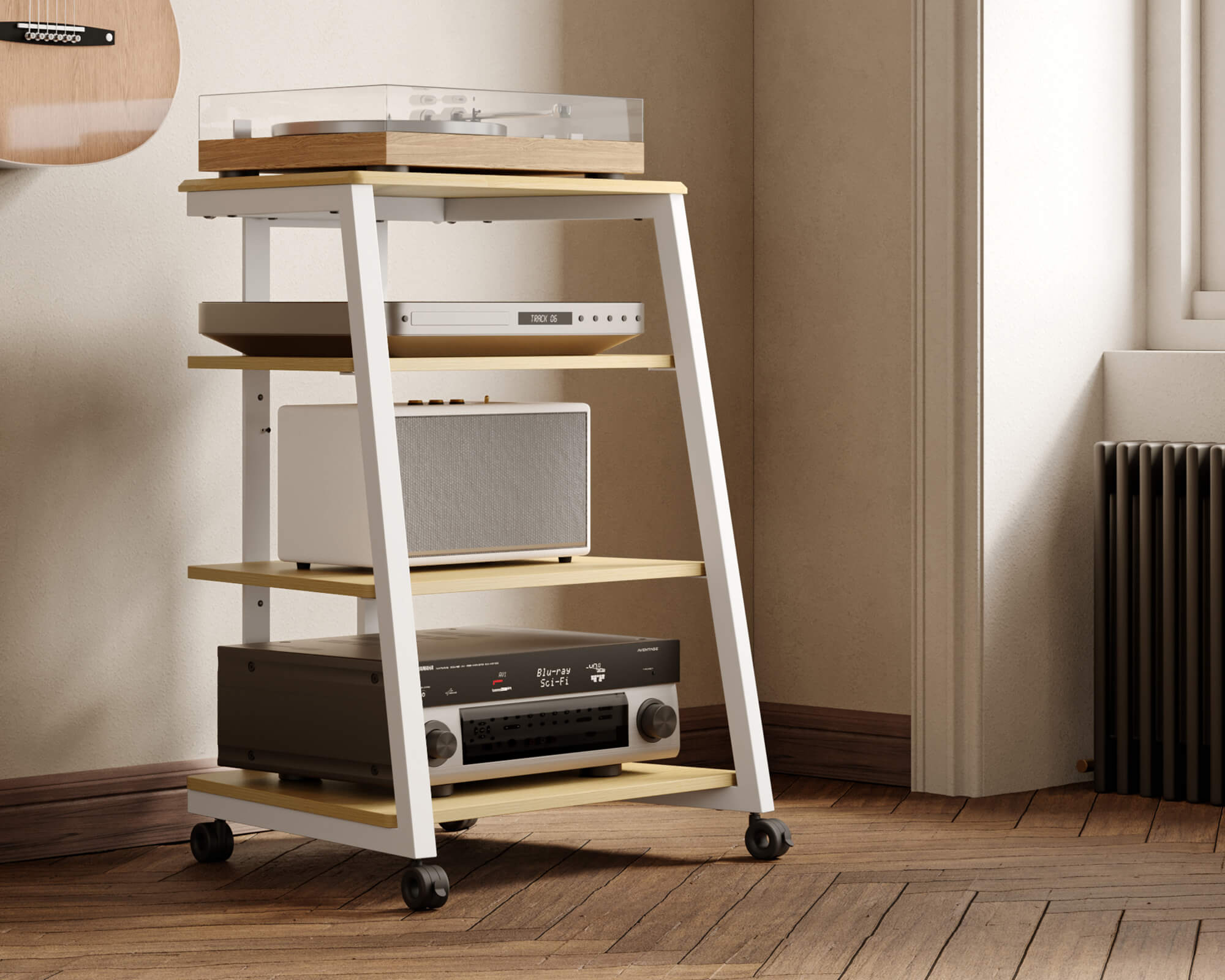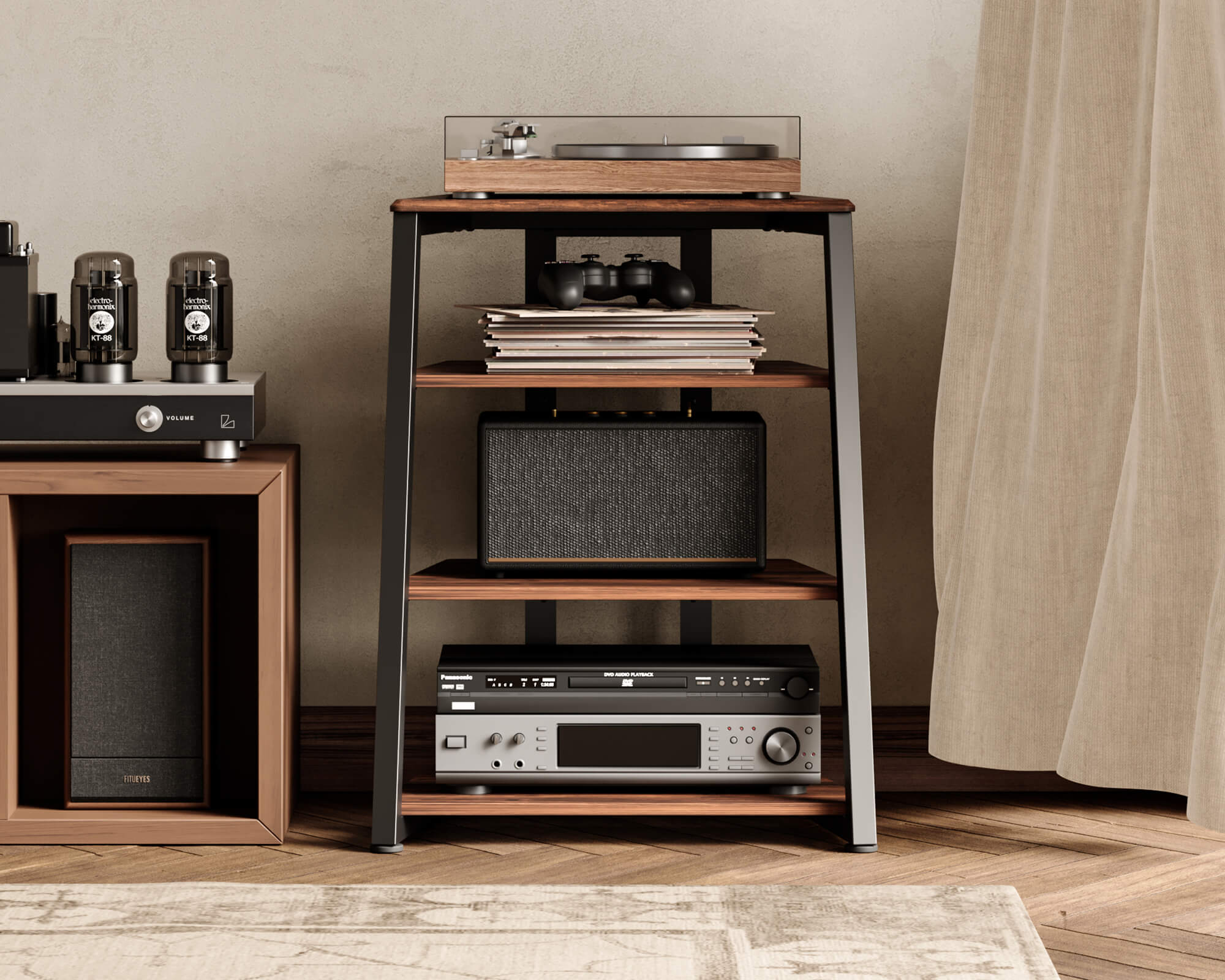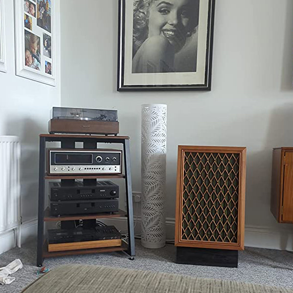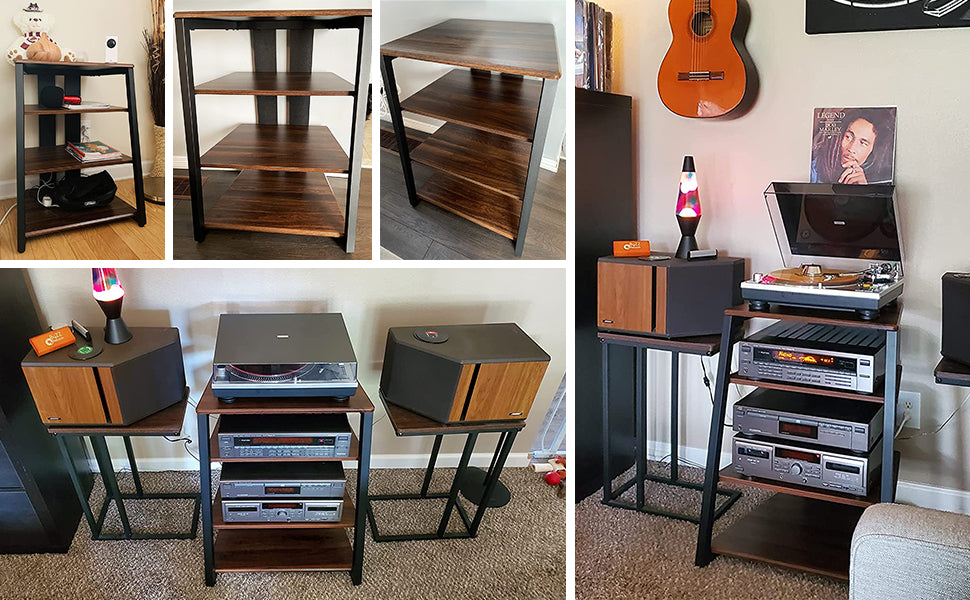 Diversamente dal comune supporto HIFI, questo supporto è realizzato in una pregiata costruzione in acciaio e legno ed è molto, molto robusto e stabile. Ogni ripiano in legno ha una buona stabilità termica e può resistere a una differenza di temperatura tre volte superiore a quella del vetro comune. Il supporto ha una capacità di carico dall'alto verso il basso di 50kg/20kg/20kg/50kg.