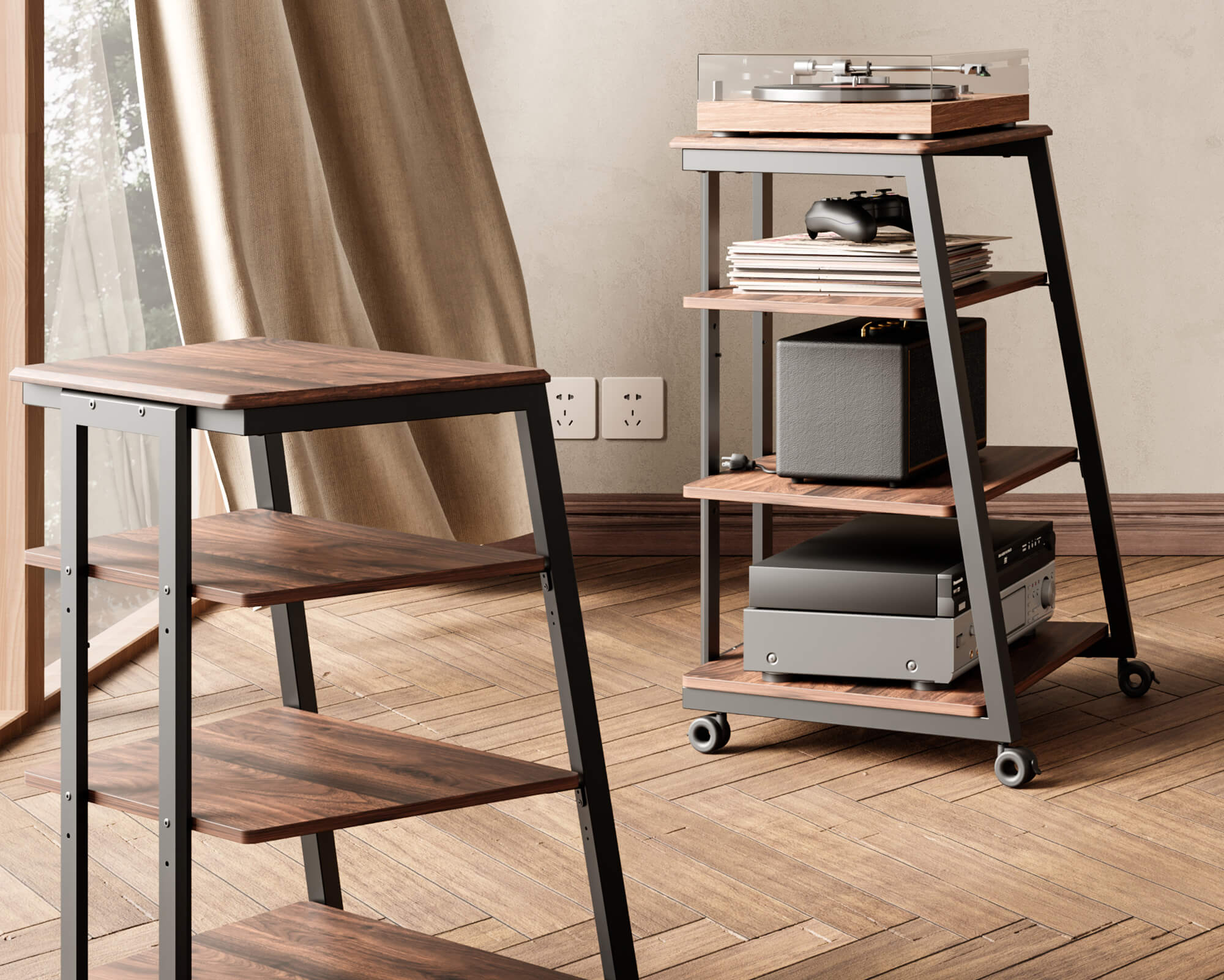 Inoltre, i due ripiani centrali possono essere regolati in altezza su 2 livelli per adattarsi a diverse altezze dei dispositivi. Puoi spostare il ripiano centrale verso l'alto di 44,3 mm, in modo che la distanza sia di 284,3 mm.