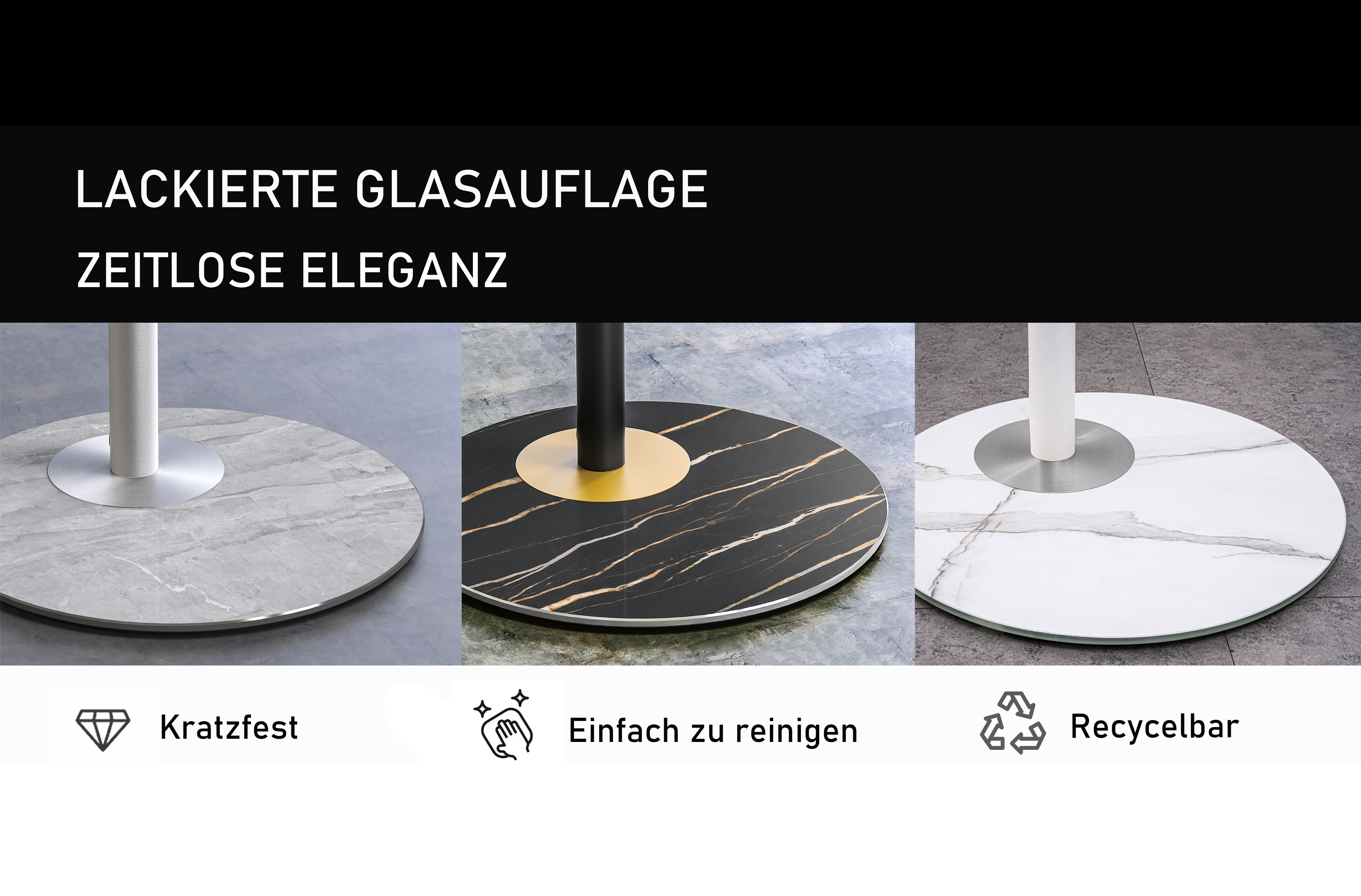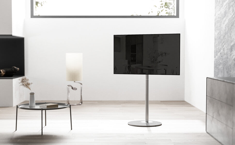 La colonna TV è realizzata in alluminio fino. La base rotonda in acciaio con un rivestimento in vetro verniciato conferisce stabilità. Il rivestimento in vetro verniciato con motivo in pietra sinterizzata porta un'atmosfera particolare in ogni stanza.