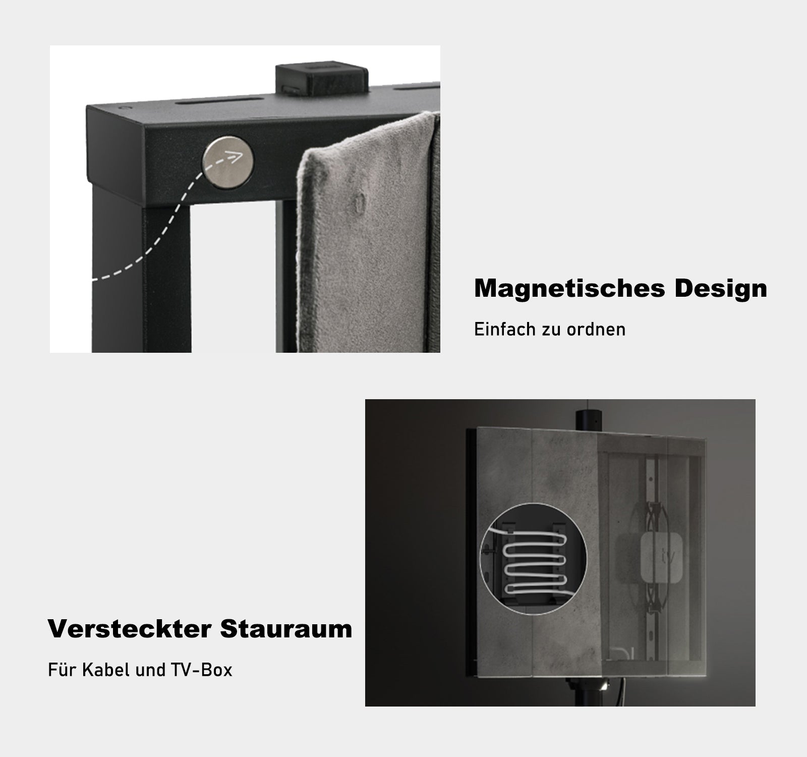 La copertura in velluto sul retro del supporto TV per nascondere gli accessori e offrire spazio di archiviazione. Il magnete magico sulla copertura in velluto facilita l'apertura e la chiusura.