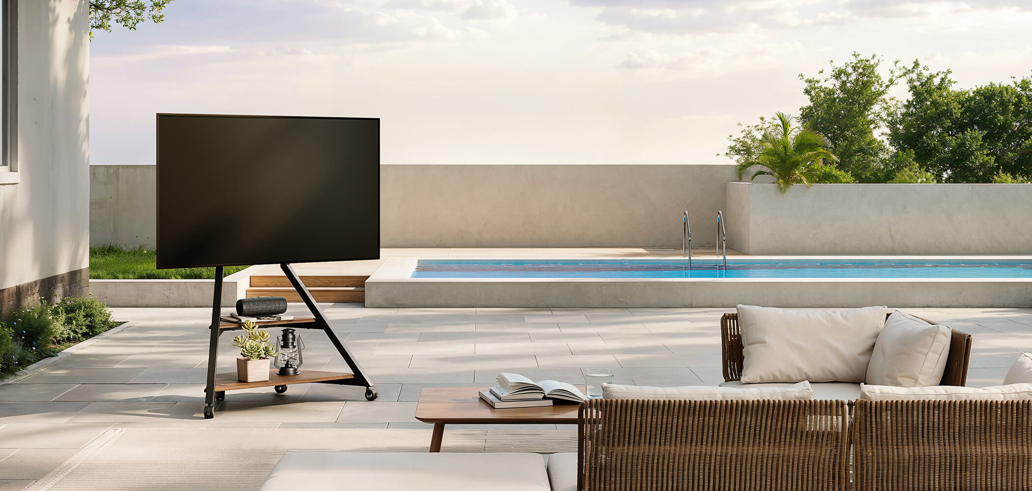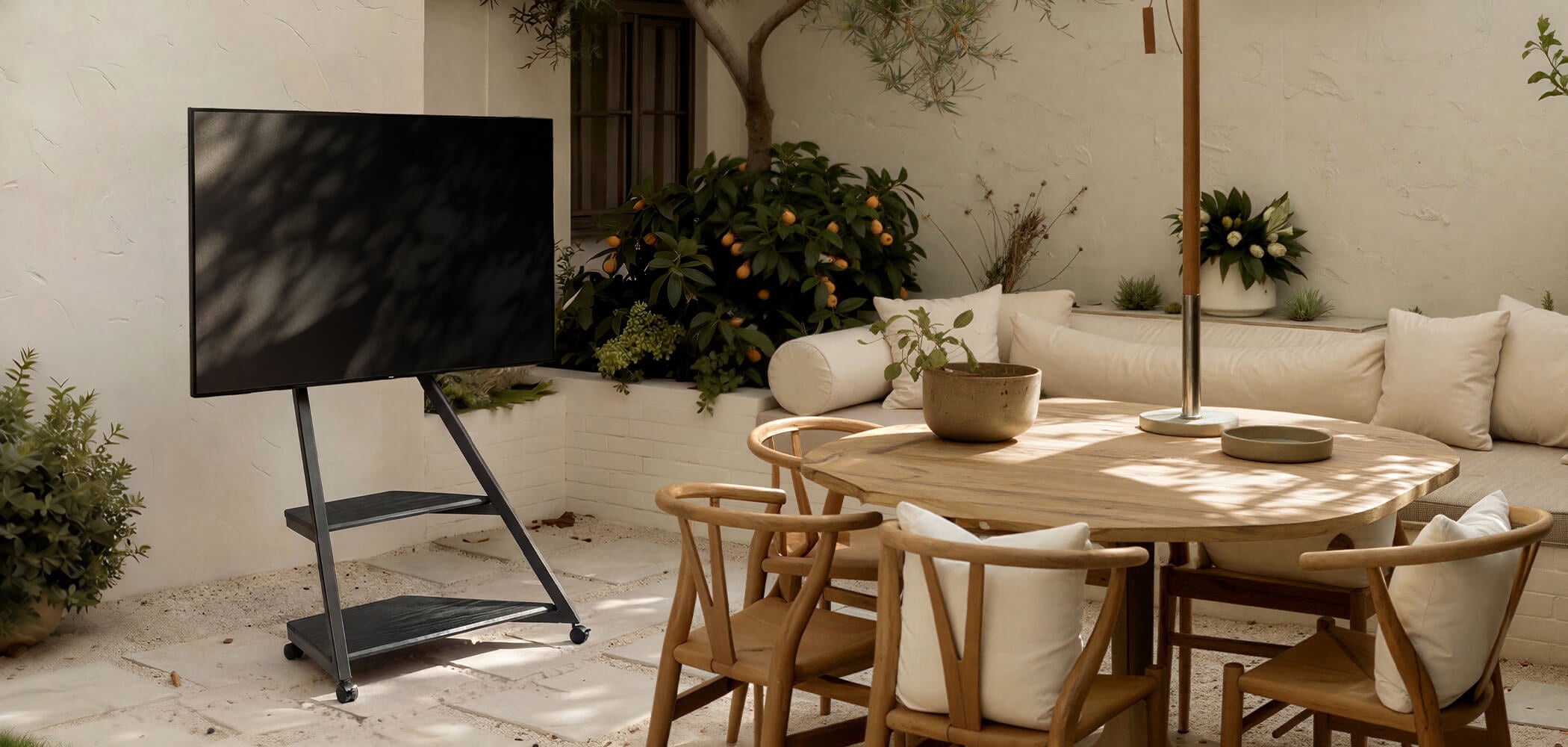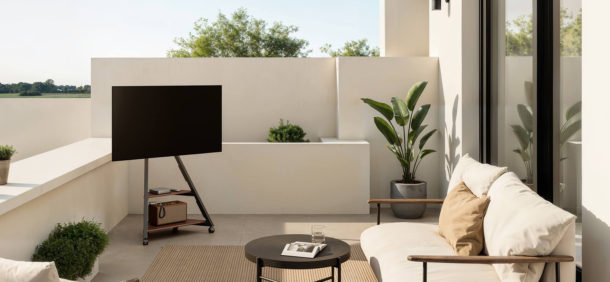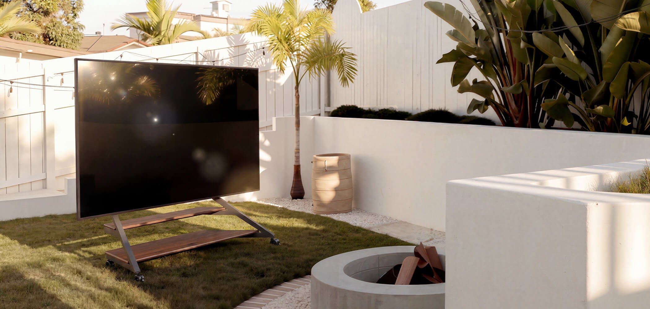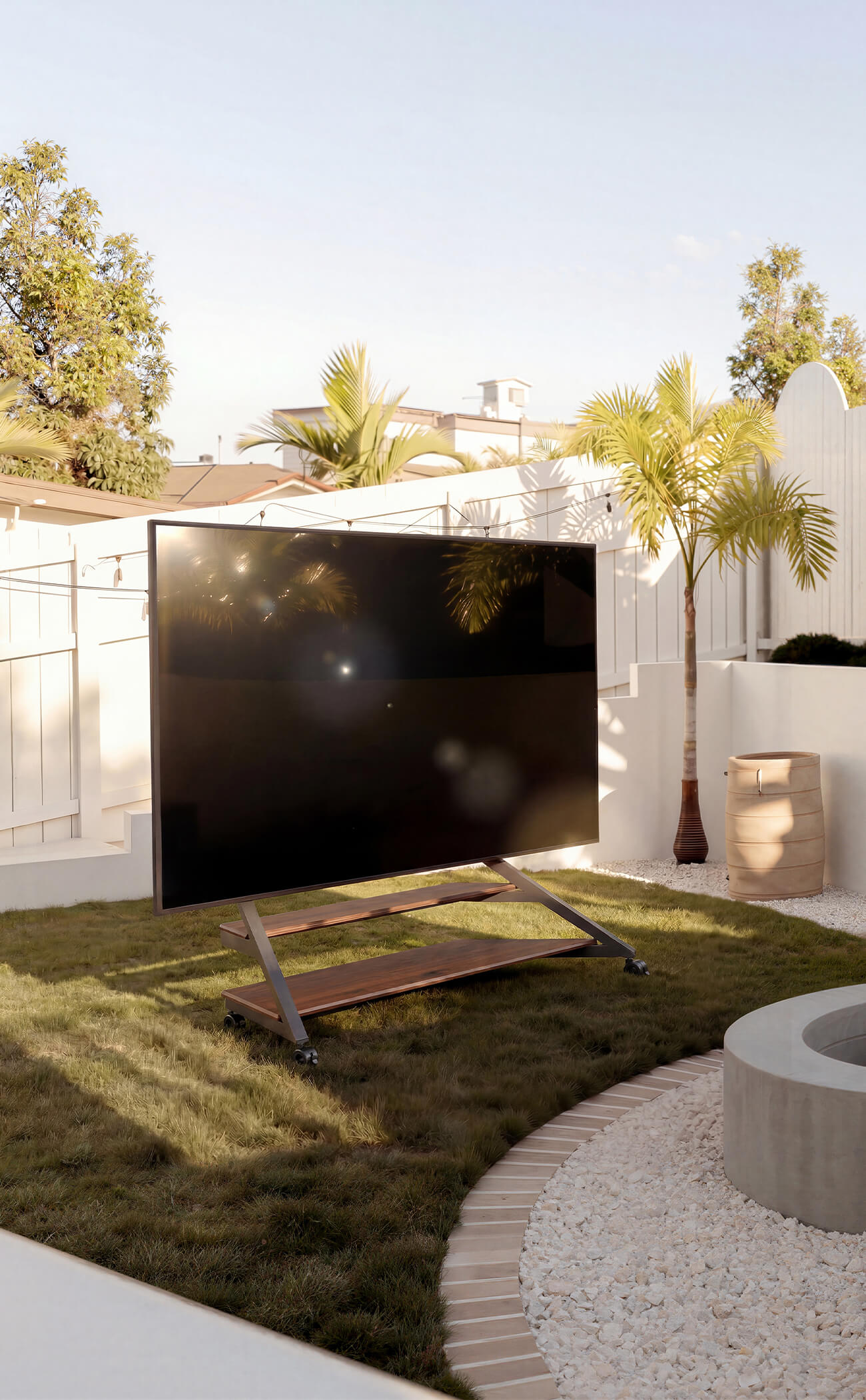 Ja. Onze outdoor TV-standaard is uitgerust met soepel lopende wielen en een betrouwbaar remsysteem. Hij is moeiteloos te verplaatsen over balkons, terrassen en gazons en kan stevig worden vastgezet om stabiliteit en veiligheid tijdens het gebruik te garanderen.
